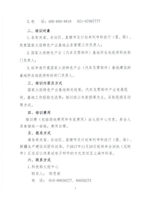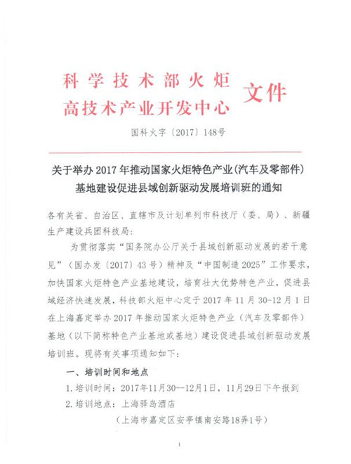 關于舉辦推動國家火炬特色產業(汽車及零部件)基地建設促進縣域創新驅動發展培訓班的通知