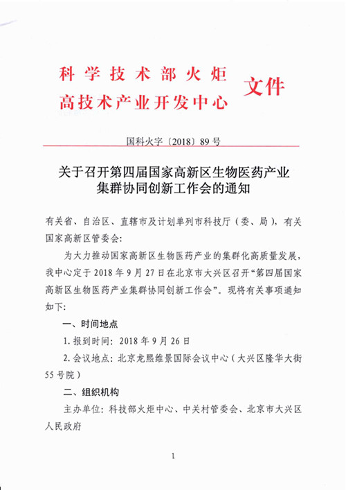 關于召開第四屆國家高新區(qū)生物醫(yī)藥產業(yè)集群協同創(chuàng)新工作會的通知