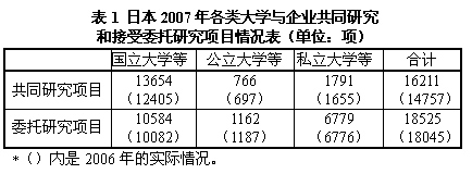 包括設立TLO在內的一系列政策措施,極大地促進了日本產學官聯合的發展。2007年,僅日本各類國立大學的共同研究項目就超過了13000件,國公私立大學合計突破了16000件(詳見表1)。產學合作研究和企業委托研究的數量大幅度增加,以往那種企業對大學(教師)的“交往型”產學合作,開始向“以契約為基礎的高透明度”產學合作轉變。