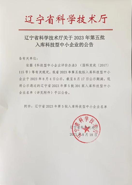 遼寧省2023年第5批入庫科技型中小企業名單公告正文.jpg PICTURE