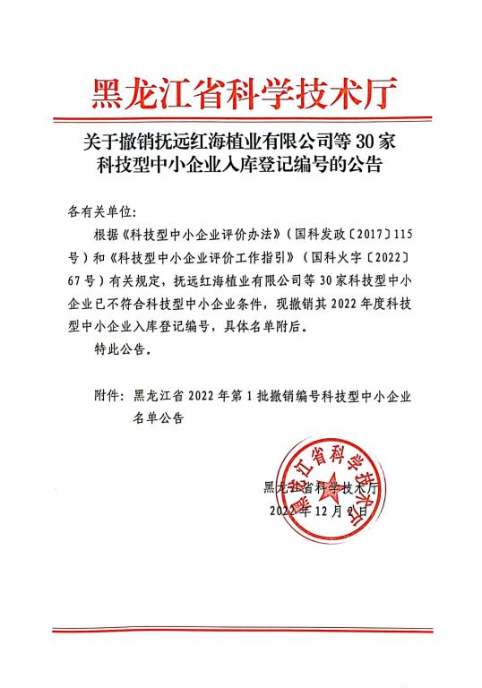 黑龍江省2022年第1批撤銷編號科技型中小企業(yè)名單公告