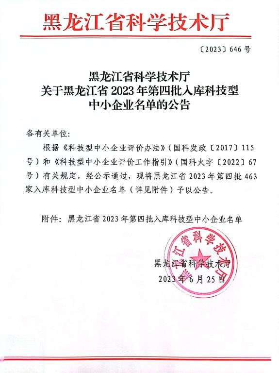 黑龍江省2023年第4批入庫(kù)科技型中小企業(yè)名單公告