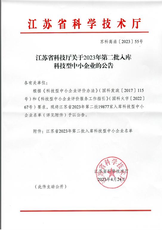 江蘇省2023年第2批入庫科技型中小企業名單公告正文.jpg PICTURE