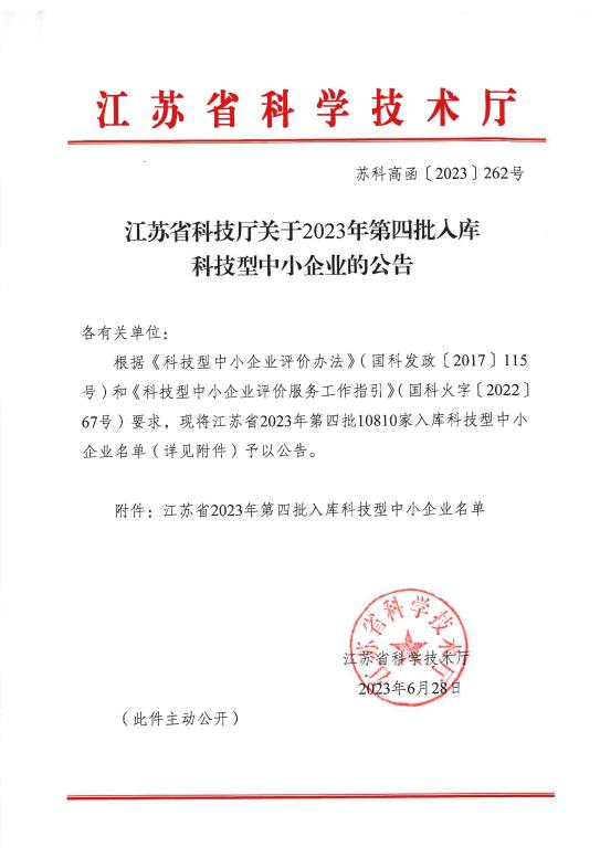 江蘇省2023年第4批入庫科技型中小企業名單公告正文.jpg PICTURE