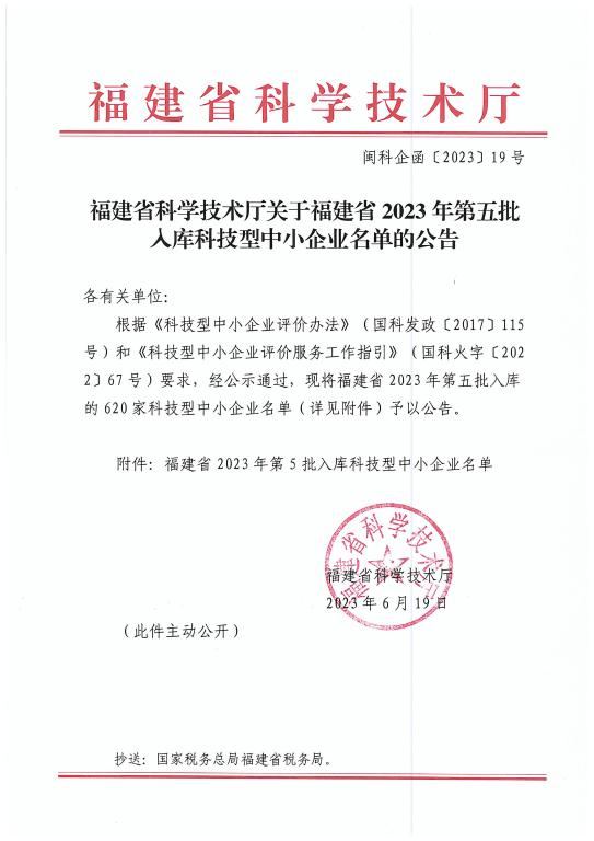福建省2023年第5批入庫科技型中小企業名單公告正文.jpg PICTURE