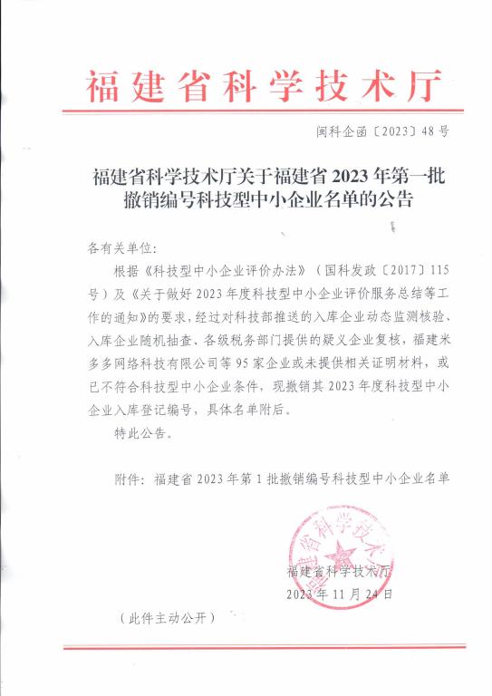 福建省2023年第1批撤銷編號科技型中小企業(yè)名單公告