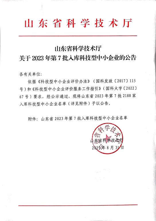 山東省2023年第7批入庫(kù)科技型中小企業(yè)名單公告正文.jpg PICTURE