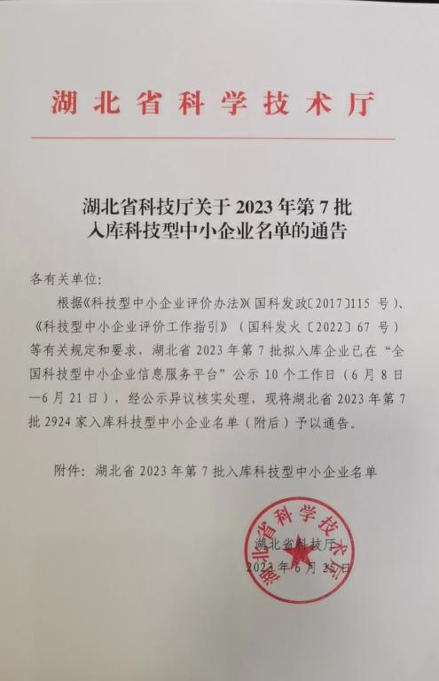 湖北省2023年第7批入庫科技型中小企業(yè)名單公告
