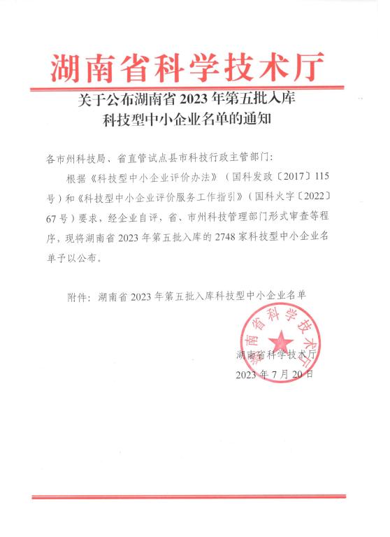 湖南省2023年第5批入庫(kù)科技型中小企業(yè)名單公告正文.jpg PICTURE
