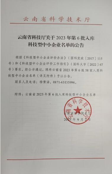 云南省2023年第6批入庫科技型中小企業名單公告正文.jpg PICTURE