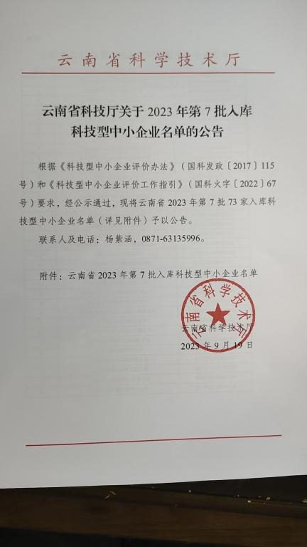 云南省2023年第7批入庫科技型中小企業(yè)名單公告