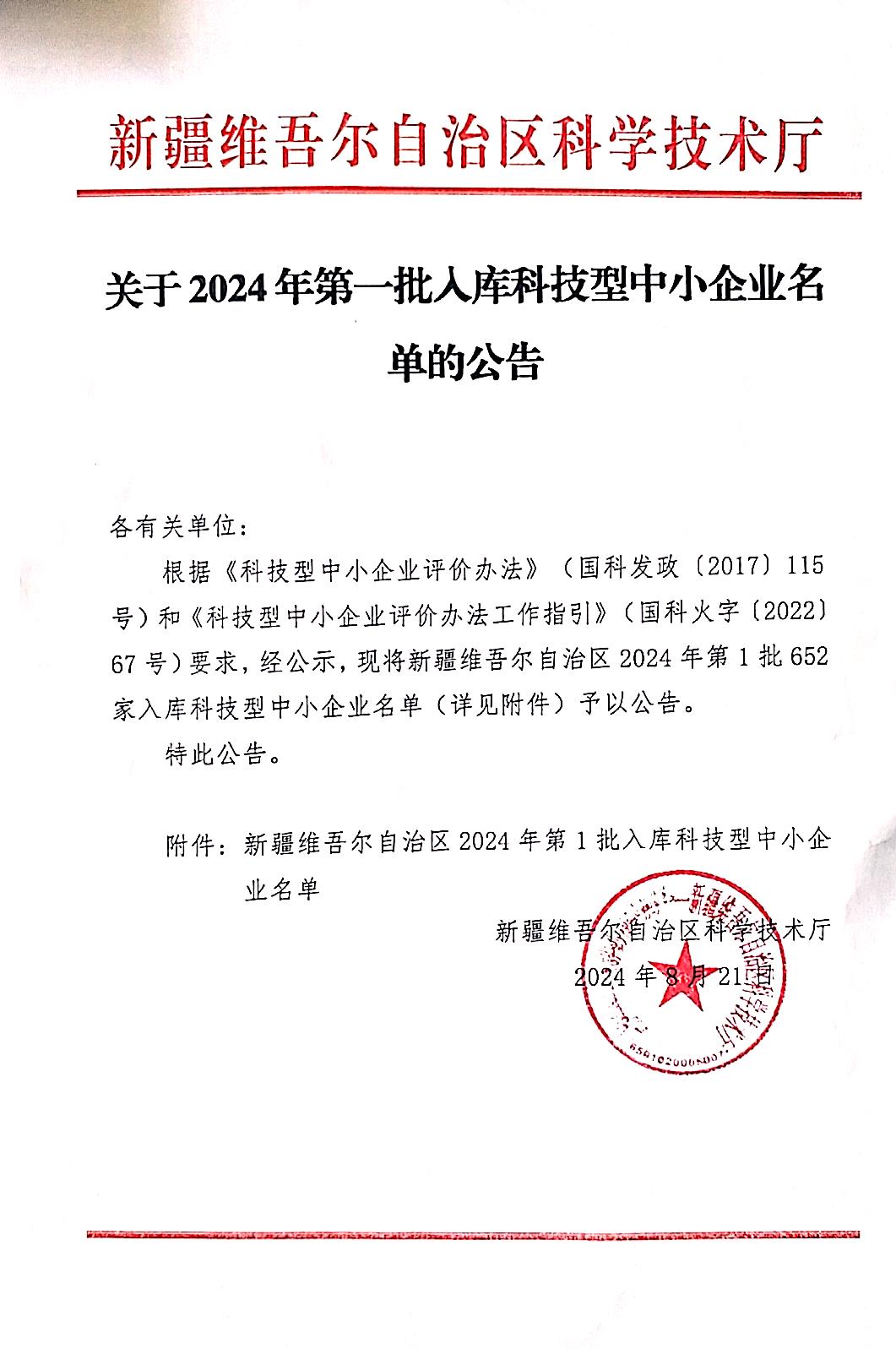 新疆維吾爾自治區2024年第1批入庫科技型中小企業名單公告正文.jpg PICTURE