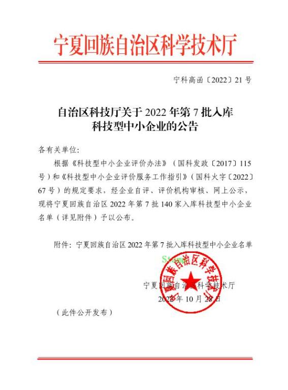 寧夏回族自治區2022年第7批入庫科技型中小企業名單公告正文.jpg PICTURE