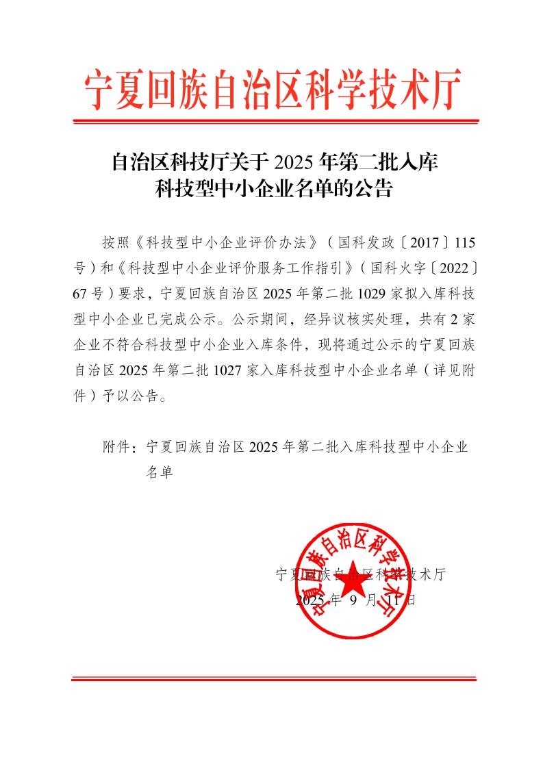 寧夏回族自治區2025年第2批入庫科技型中小企業名單公告正文.jpg PICTURE