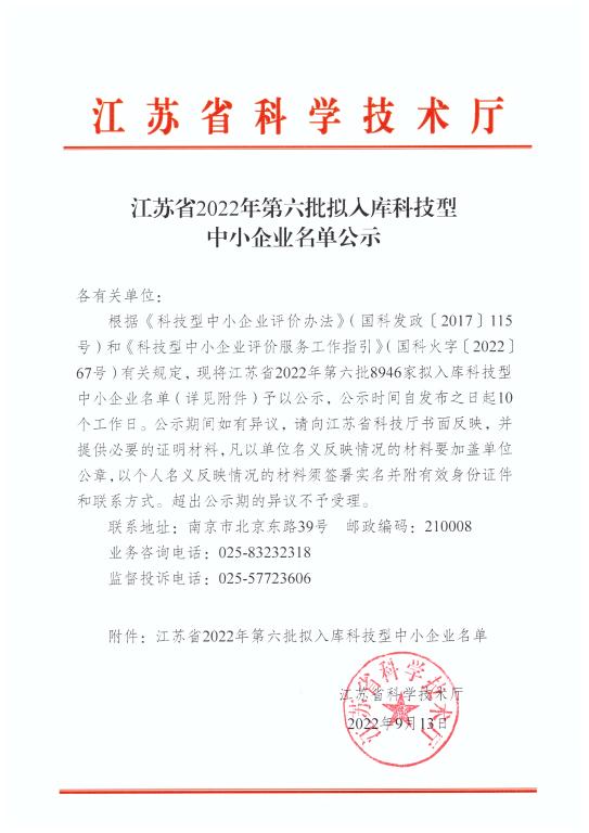 江蘇省2022年第6批擬入庫科技型中小企業名單公示正文.jpg PICTURE