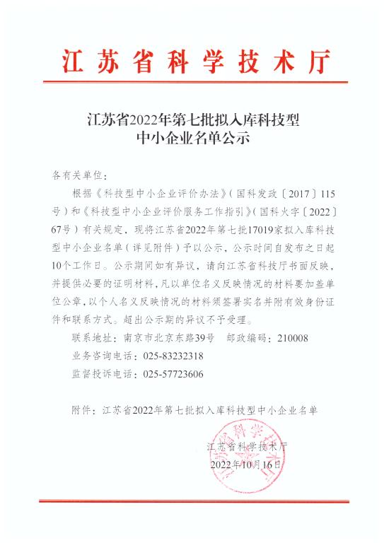 江蘇省2022年第7批擬入庫科技型中小企業名單公示正文.jpg PICTURE