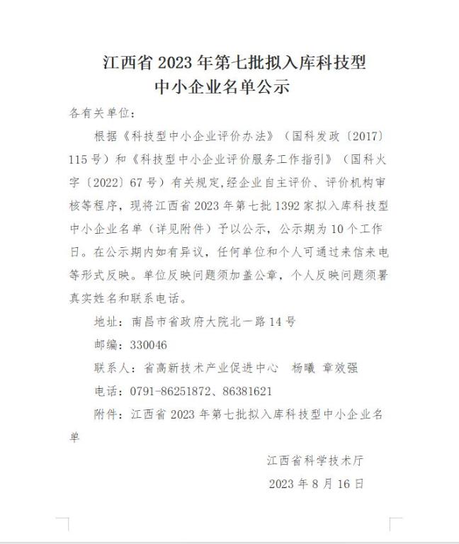 江西省2023年第7批擬入庫科技型中小企業名單公示正文.jpg PICTURE