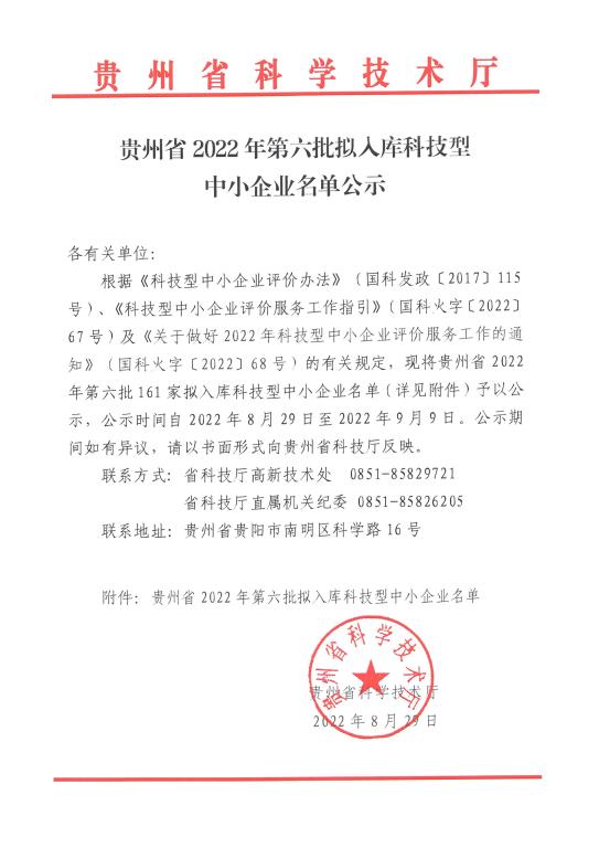 貴州省2022年第6批擬入庫科技型中小企業(yè)名單公示