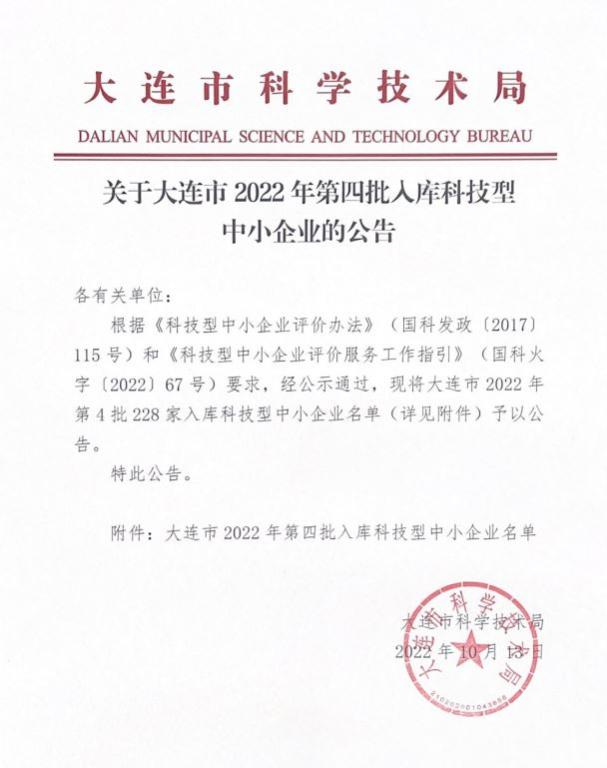 大連市2022年第4批入庫科技型中小企業名單公告正文.jpg PICTURE