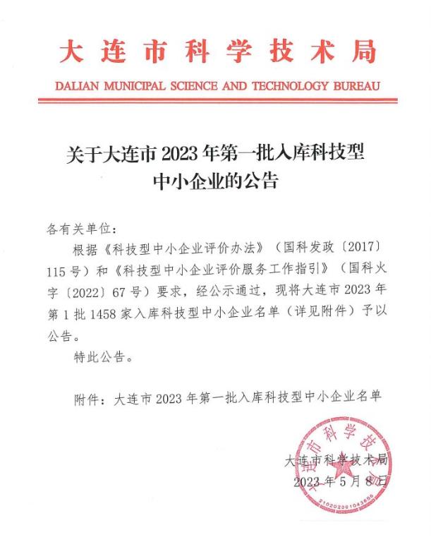 大連市2023年第1批入庫科技型中小企業名單公告正文.jpg PICTURE