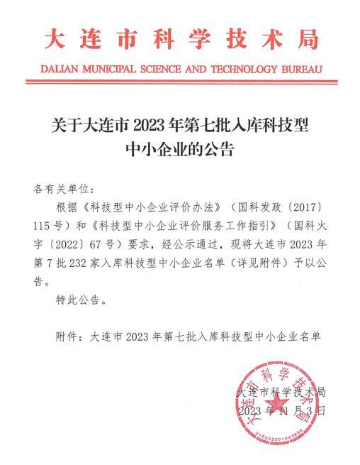 大連市2023年第7批入庫科技型中小企業名單公告正文.jpg PICTURE