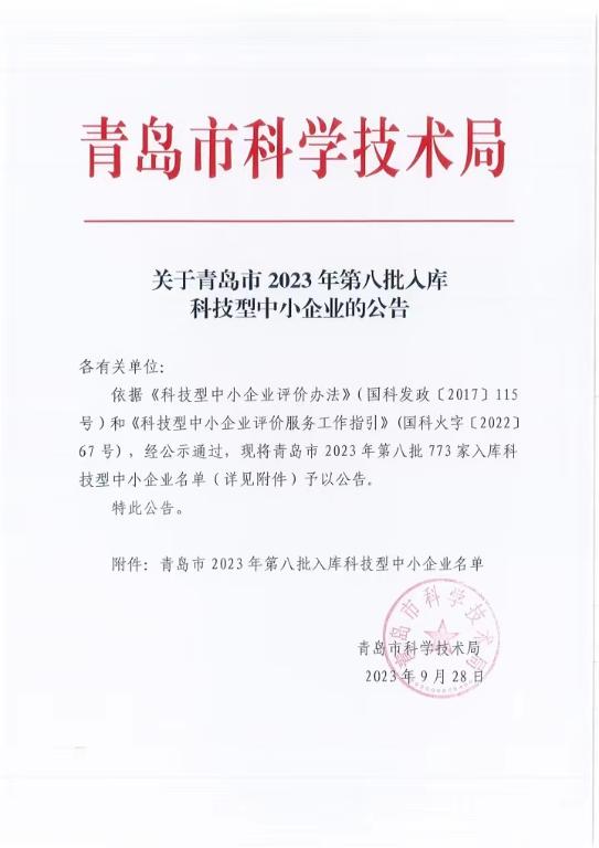 青島市2023年第8批入庫(kù)科技型中小企業(yè)名單公告正文.jpg PICTURE